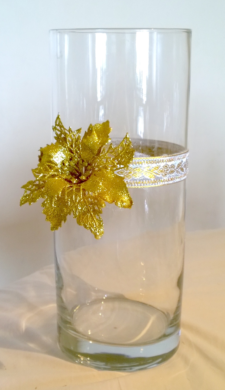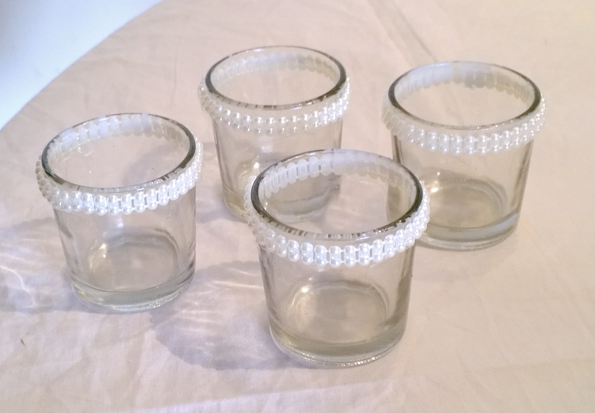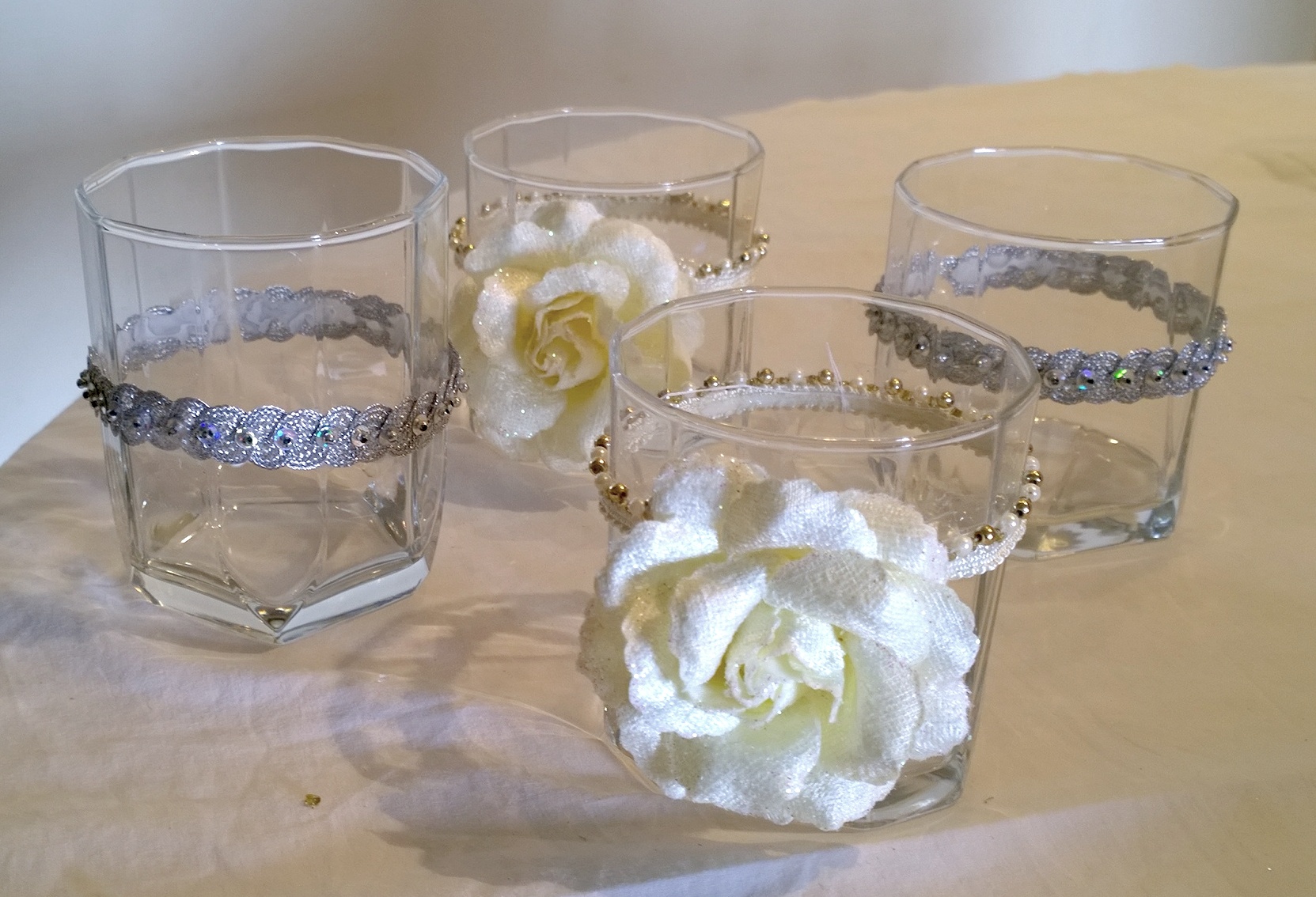 With the flowers, I first strung them with a needle and thread and tied the flower around the glass. I then stuck some lace on the thread so that it doesn’t show.